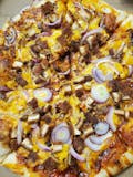 Sliced chicken, BBQ sauce, red onions, and yellow cheese.